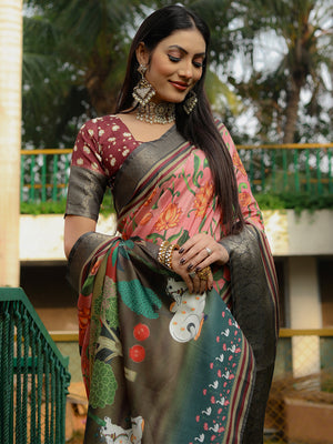 • Grey Kanjivaram Silk Saree With Blouse Piece