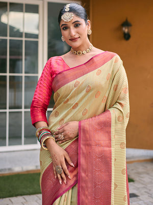 • Beige Kanjivaram Silk Saree With Blouse Piece