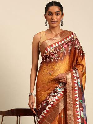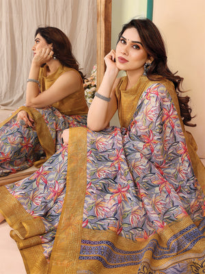 • Mustard Cotton Digital Print Saree With Blouse Piece