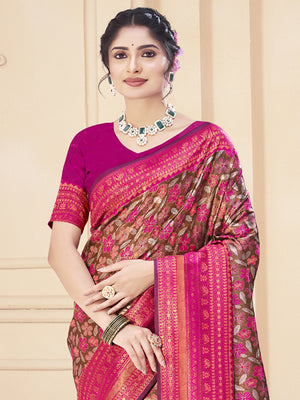 • Brown Cotton Digital Print Saree With Blouse Piece