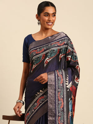 • Blue Cotton Digital Print Saree With Blouse Piece