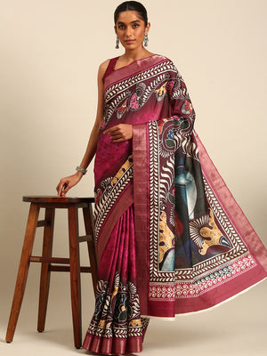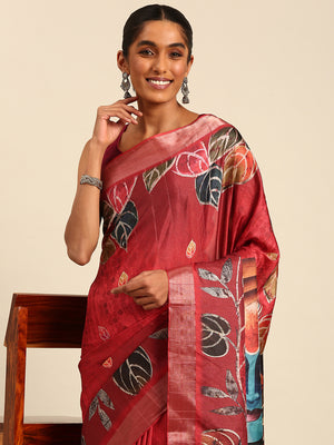 • Maroon Cotton Digital Print Saree With Blouse Piece