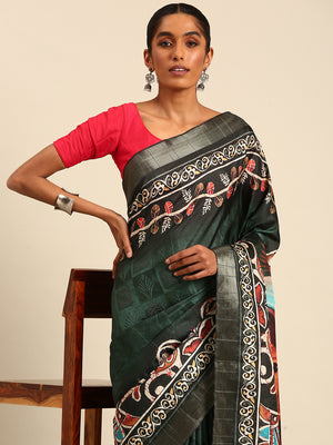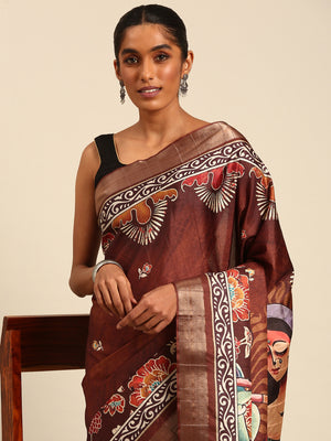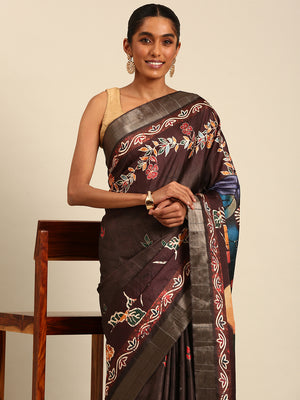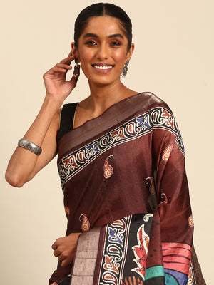 • Dark Brown Cotton Digital Print Saree With Blouse Piece