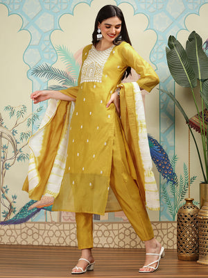 Yellow Floral Embroidered Thread Work Straight Kurta With Trousers & With Dupatta