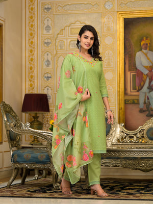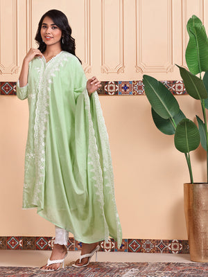 Green Embroidered Regular Sequinned Straight Kurta With Trousers & Duppatta