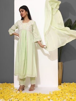 Floral Embroidered Mirror Work Pure Cotton Straight Kurta with Trousers & Dupatta