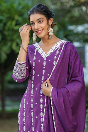 Embellished Yoke Cotton Schiffli Kurta with Lace Hemlined Pants & Art Silk Dupatta