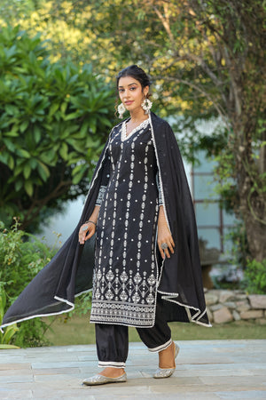 Floral Embroidered Thread Work Silk Chiffon Straight Kurta with Trousers & Dupatta