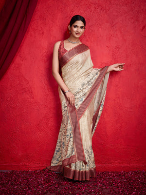 • Cream Poly Silk Festival Saree With Blouse Piece