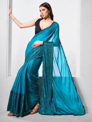 • Teal Poly Chiffon Festival Saree With Blouse Piece