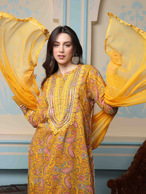 • Round Neck Straight Kurta with Trousers & Dupatta