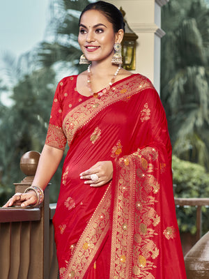 • Red Silk Saree With Blouse Piece