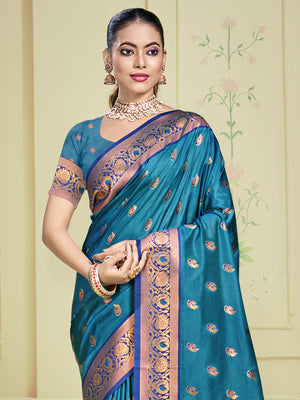 • Teal Silk Saree With Blouse Piece