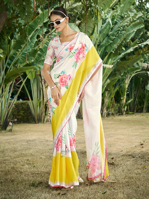 • Cream Poly Chiffon Daily Wear Saree With Blouse Piece