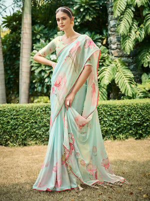 • Firozi Poly Chiffon Daily Wear Saree With Blouse Piece