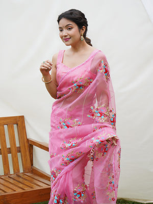 • Pink Organza Saree With Blouse Piece