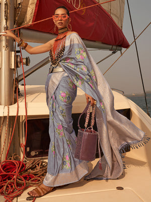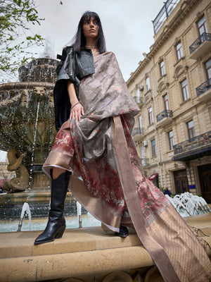 • Grey Printed Poly Brasso Saree With Blouse Piece