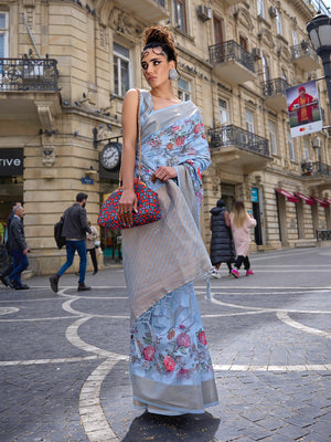 • Grey Linen Blend Saree With Blouse Piece