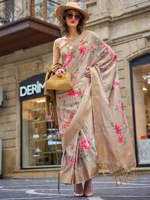 • Cream Silk Printed Saree With Blouse Piece