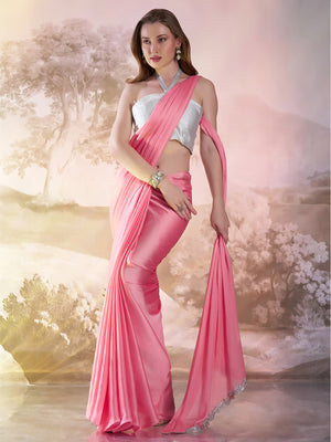 • Hot Pink Shimmer Solid Saree With Blouse Piece