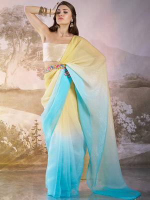 • Sky Blue Chiffon Mirror Work Designer Saree with Blouse
