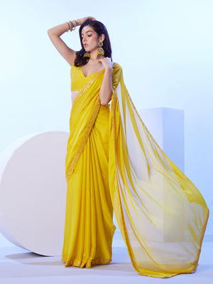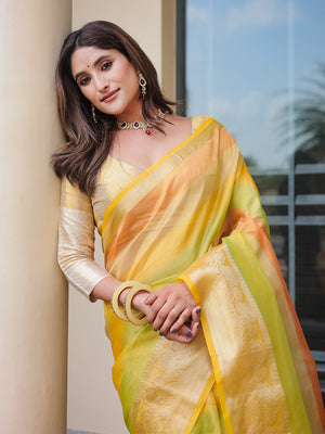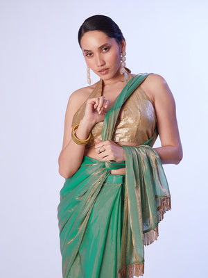 Sea Green Satin Gold Organza Saree With Designer Lace And Unstitched Blouse