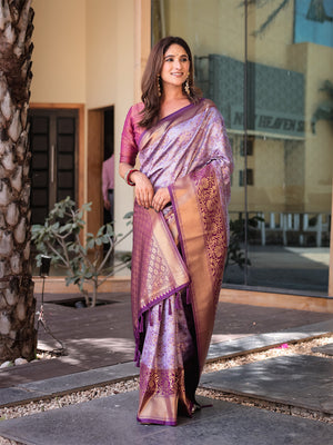 Purple & Pink Chinon Digital Printed Saree With Designer Lace And Unstitched Blouse