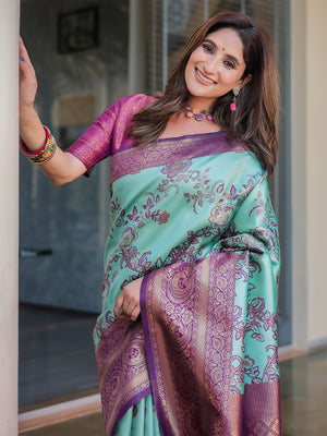Turquoise Semi Kanjivaram Pattu Silk Zari Woven Traditional Saree with Blouse