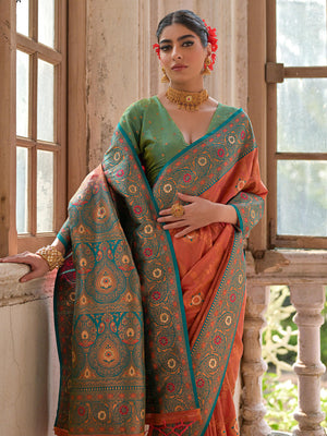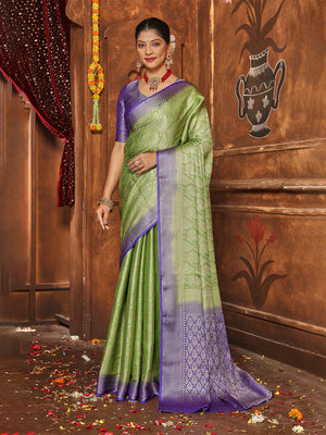 • Mehandi Banarasi Silk Blend Saree With Blouse Piece