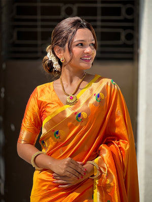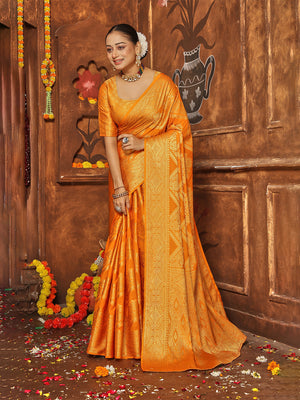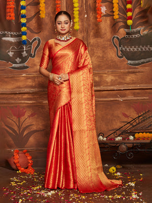 • Orange Banarasi Silk Zari Woven Saree With Blouse Piece