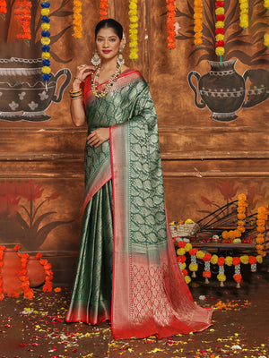 • Bottle Green Banarasi Silk Blend Saree With Blouse Piece