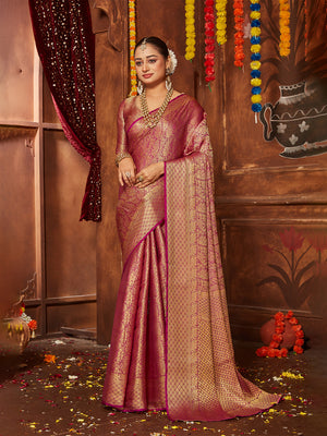 • Pink Banarasi Silk Blend Saree With Blouse Piece
