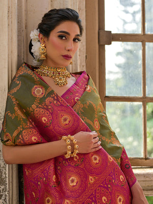 • Olive Banarasi Silk Blend Saree With Blouse Piece