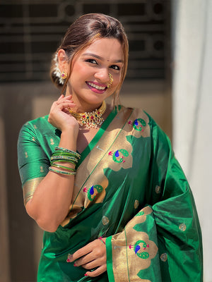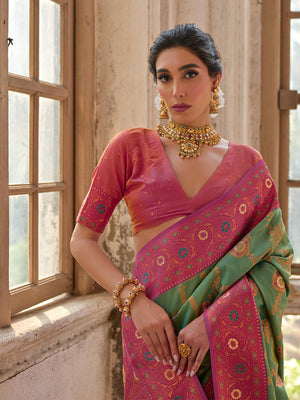 • Green Banarasi Silk Zari Woven Saree With Blouse Piece
