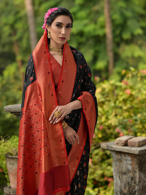 • Black Banarasi Silk Zari Woven Saree With Blouse Piece