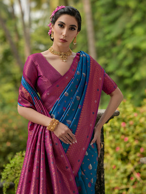 • Blue Banarasi Silk Blend Saree With Blouse Piece