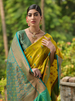 • Yellow Banarasi Silk Blend Saree With Blouse Piece