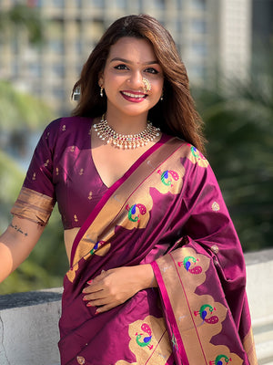 • Wine Banarasi Silk Zari Woven Saree With Blouse Piece