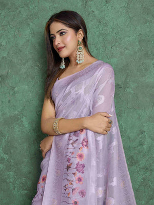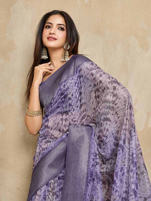 Lavendar Silk Chiffon Viscose Border Floral Printed Saree Saree With Blouse Piece