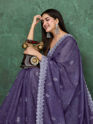 Purple Cotton Banarasi Printed Saree With Thread Embroidery Scalloping Saree With Blouse Piece