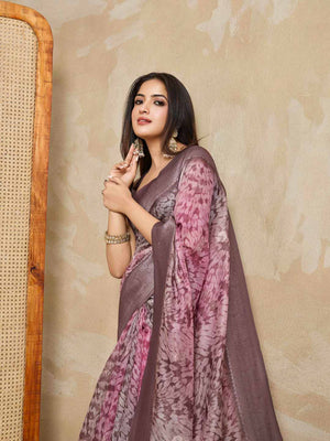 Onion-Pink Silk Chiffon Viscose Border Floral Printed Saree Saree With Blouse Piece