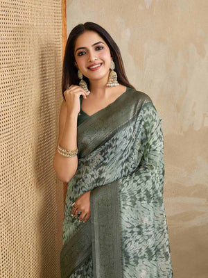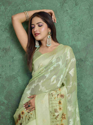 Light Green Silk Chiffon Viscose Border Floral Printed Saree Saree With Blouse Piece