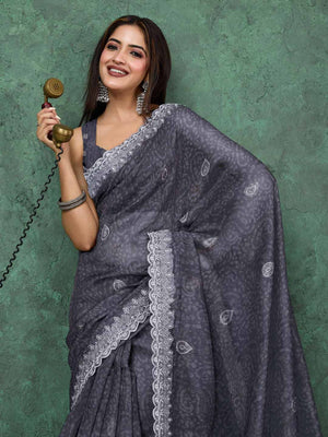Grey Cotton Banarasi Printed Saree With Thread Embroidery Scalloping Saree With Blouse Piece
