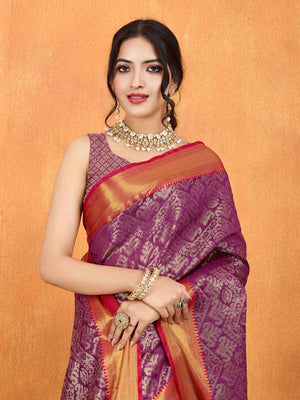 Purple Pure Handloom Tussar Woven Pallu Ajrakh Printed With Blouse Piece
