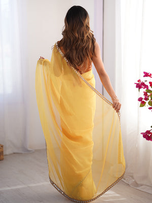 • Yellow Mirror Work Solid Satin Chiffon Saree With Blouse Piece