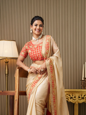 • Beige Chiffon Embroidered Saree With Blouse Piece