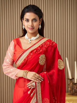 • Red Chiffon Embroidered Saree With Blouse Piece