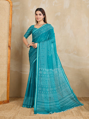 Poly Georgette Geometric Printed Saree With Embroidered Border And Blouse Piece