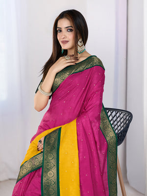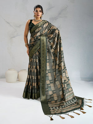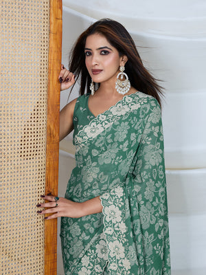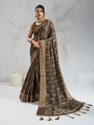 Poly Silk Woven Floral Digital Printed Saree With Woven Jacquard Border And Fancy Tassels