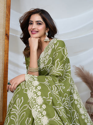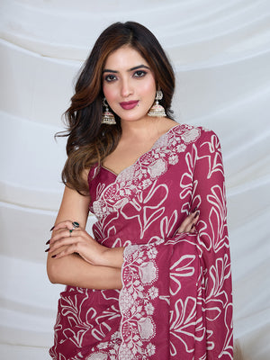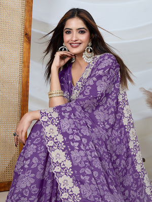 Poly Georgette Geometric Print Saree With Embroidery And Scaloping Work With Unstitched Blouse Piece